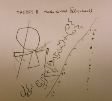 The Y-shaped glyph is W for AW-W, and a doubtful snake for GJH (presumably a horned viper for N, with a cobra N preceding it on the other side of the D). It is clearly Q (an impossible identification for the consensus cabal, under the leadership of Frank Moore Cross, Jr; Albright had read NS.B as NQB, and this belief became set in stone). We keep seeing Q in all the old familiar places, but Thebes and Sinai are our favourite rendezvous (plural); and so there are two Q conspiracies in America at present in the Trump era (let the percipient reader understand). Look at the letter Q/q as we now delineate it; this form is more likely to have descended from a character with a stem (--o- or --o<) than a tied bag (Oo or O<); the Arabian forms of S. and Q sort this out for us (refer to the Arabia column of my table of signs). It's a cinch! However, we fervently hope the Arabian Semites did not do another reversal, as with Th and Sh.
